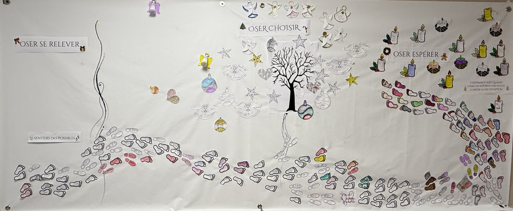 Pendant les trois semaines avant Noël, chacun avait à sa disposition, une porte miniature, qui a permis de recueillir les réflexions et le cheminement de chacun, il été ensuite possible de l’épingler sur notre « porte de l’Avent » – Chaque semaine, une phrase a guidé la réflexion. À cela s’est ajouté une collecte au profit de l’Assajuco Emmaüs de Dieuze